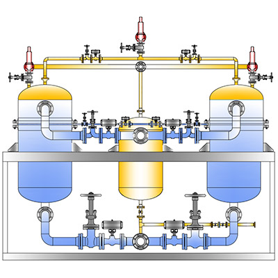 雙筒自動反沖洗過濾系統(tǒng)由兩套并聯(lián)安裝的過濾器及自動控制系統(tǒng)組成。該過濾系統(tǒng)設(shè)計用于連續(xù)過濾工況,系統(tǒng)在沒有關(guān)鍵性的報警時,總有一臺過濾器在線操作,而另一臺過濾器處于備用狀態(tài)或正處于反洗和清潔過程中,過濾系統(tǒng)可選擇帶有污油接收罐或由用戶解決污油排放問題。