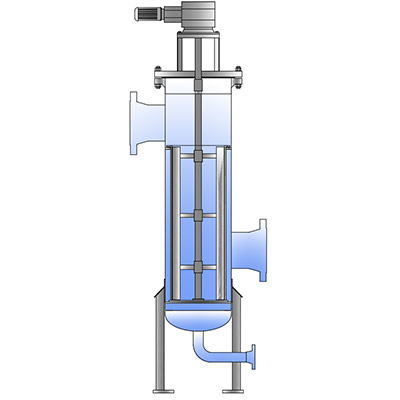 當(dāng)過濾器的壓差達到預(yù)設(shè)值時,將開始自動清洗過程,首先啟動驅(qū)動電機帶動減速機轉(zhuǎn)動,帶動刮刀旋轉(zhuǎn)清洗濾網(wǎng)表面形成的濾餅,同時打開排污閥。刮刀中間設(shè)置與排污管聯(lián)通的多個顆粒吸入口,刮刀刮掉的濾餅經(jīng)吸入口吸入通過排污管排出過濾器。自清洗過程中過濾不間斷,整個清洗過程只需數(shù)十秒鐘,自清洗結(jié)束后停止驅(qū)動電機,同時關(guān)閉排污閥。